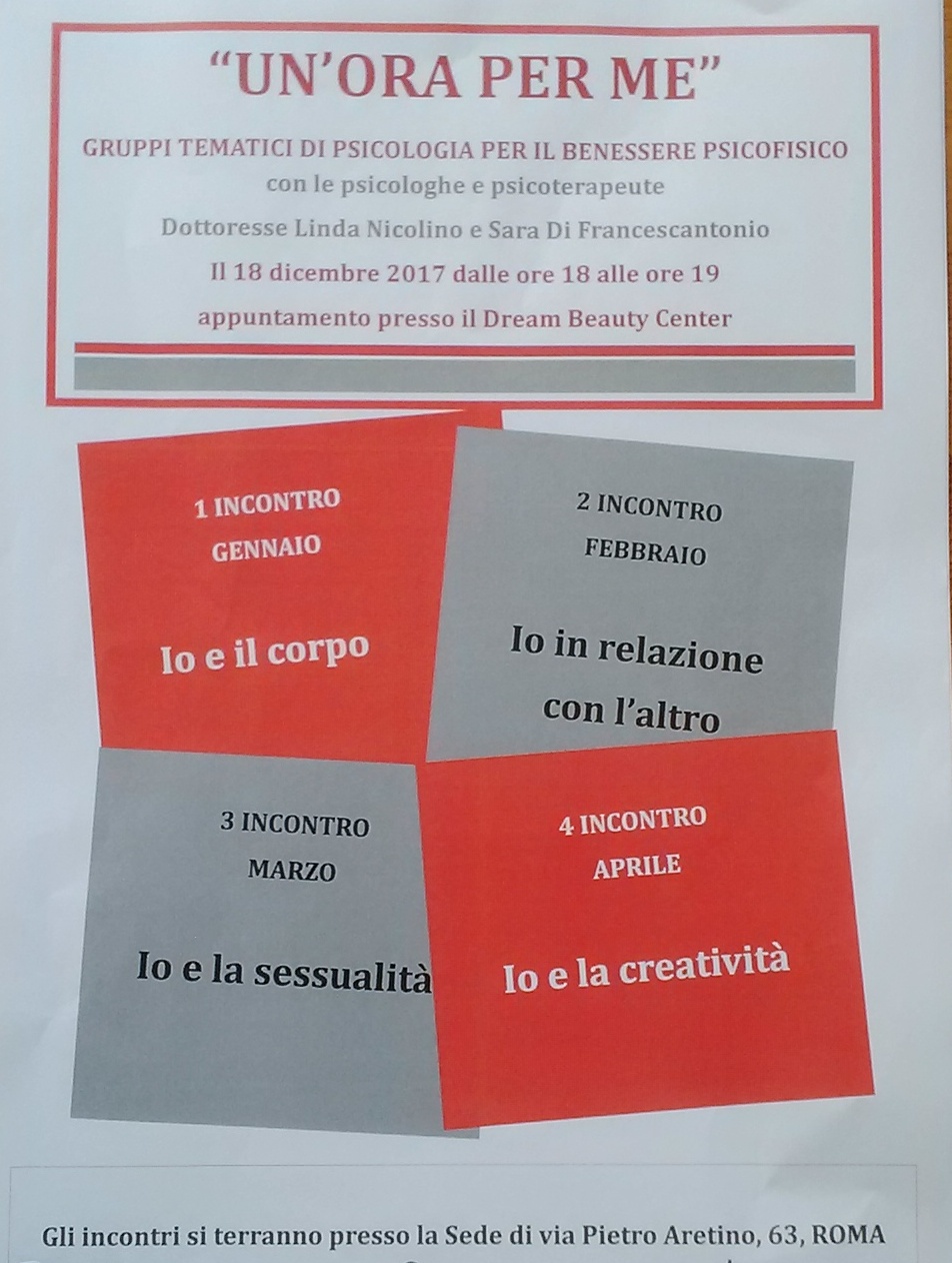 È attualmente possibile partecipare agli incontri tematici di gruppo “Un’ora per me”. Incontri tematici dedicati alla consapevolezza del proprio benessere psicofisico.